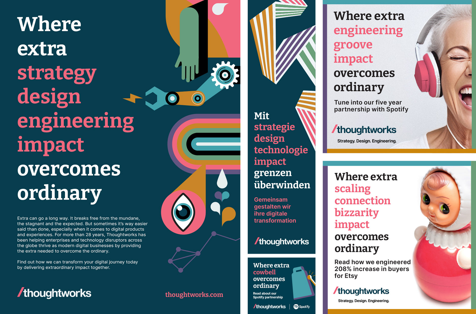 Thoughtworks needed a brand evolution that could match its ambition. A small, focused team — including myself — took on the challenge. The result? A rebrand that elevated every detail: a timeless logo, an accessible color palette, fresh photography and bold new illustrations. Then we turned up the volume — bringing in a copywriting powerhouse and rolling out the company’s first-ever global ad campaign. The brand didn’t just evolve; it stepped onto the world stage.